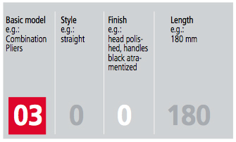 Using this information you can tell Knipex part number 87 01 250 is a Cobra Plier(87) with the standard jaw(0), polished head with plastic coated handle (1), and is 250mm in overall length.